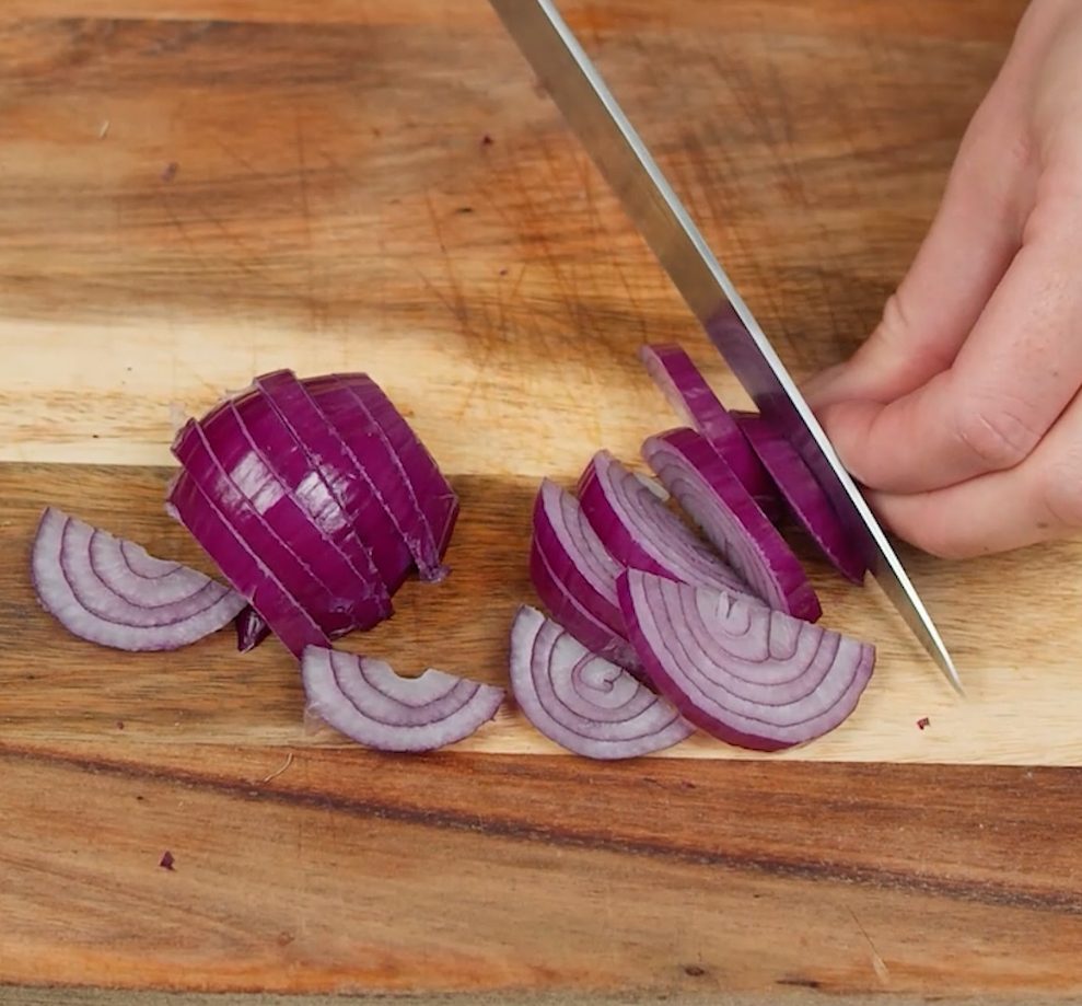 1. Förbered löken: Halvera rödlöken på längden och ta bort det yttersta skalet. Skiva sedan löken tunt.