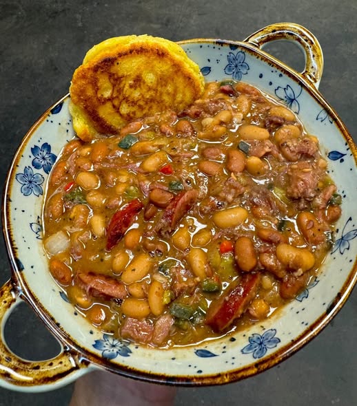 Servera de rykande varma bönorna med nygräddade Johnny Cakes – en rustik, mustig och tröstande sydstatsmåltid.