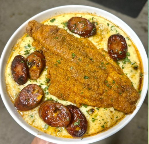 Perfekt kombination av krispig fisk, saftig korv och ostig, kryddig gröt som får smaklökarna att dansa. 💃